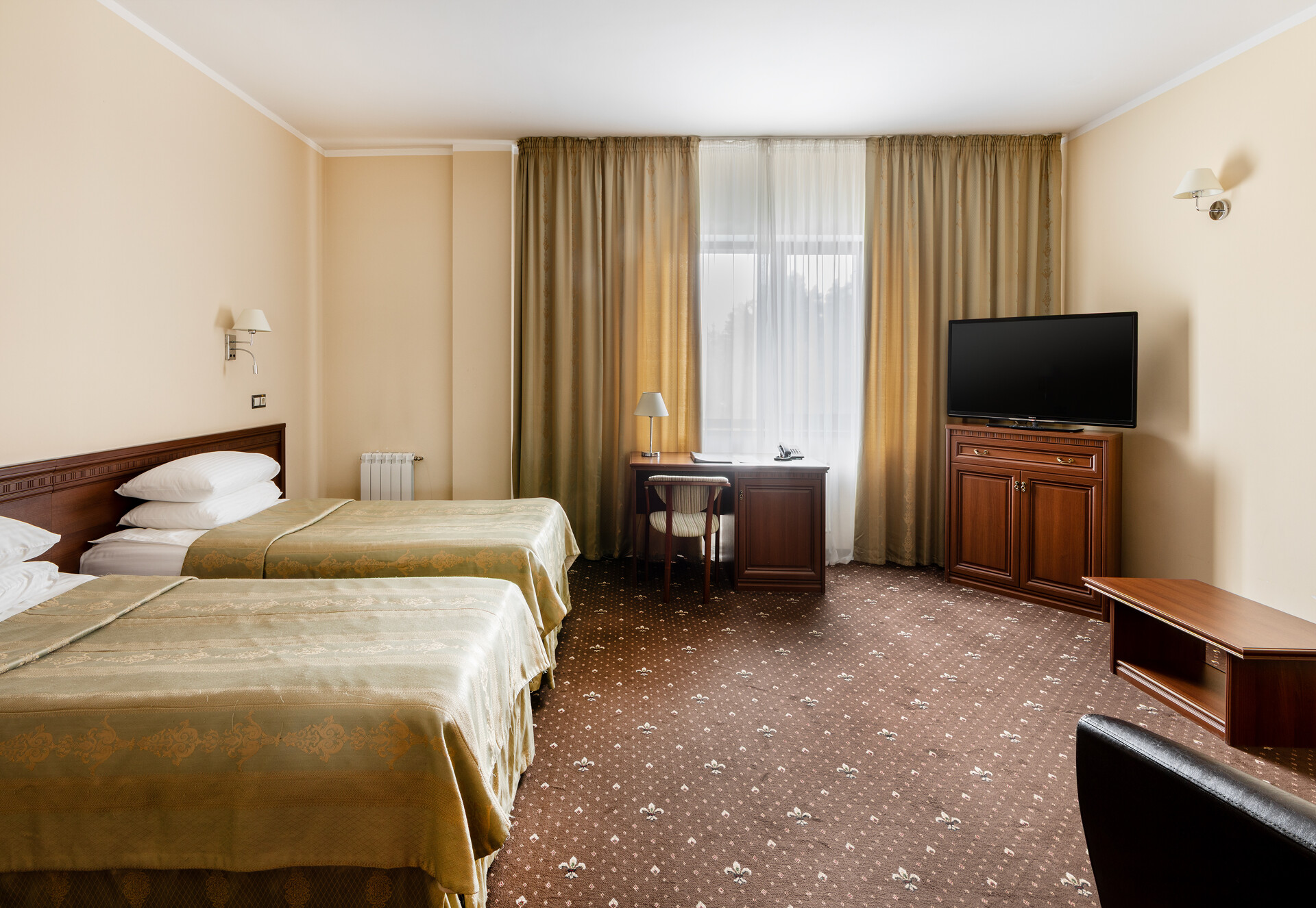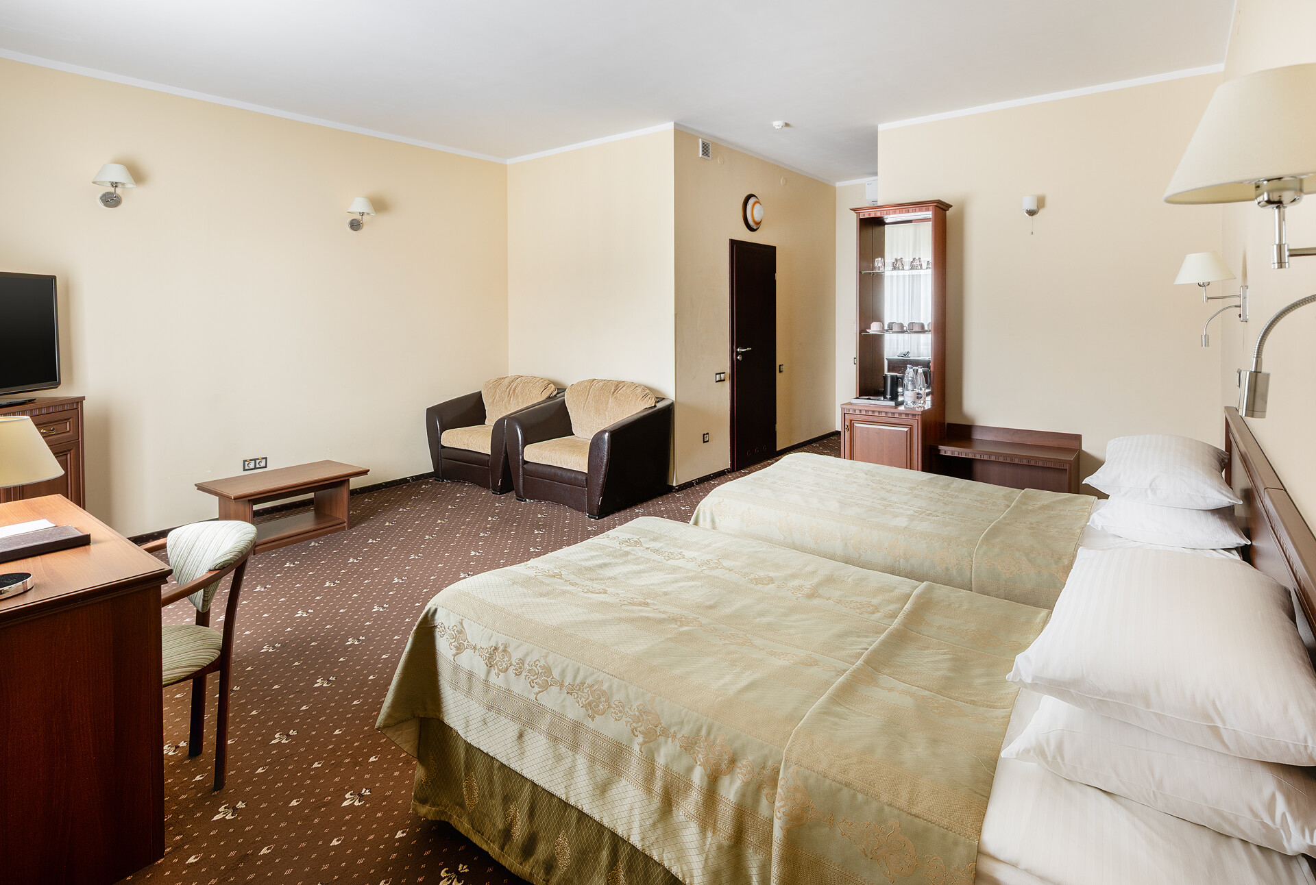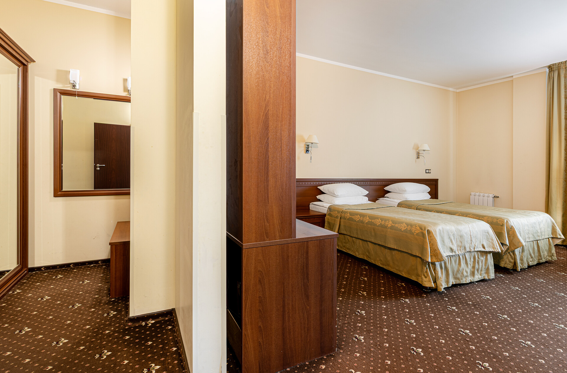 В номере: ванна, туалет, умывальник / 2-спальная кровать, Wi-Fi, кондиционер, мини-холодильник, сейф, тв, телефон, фен