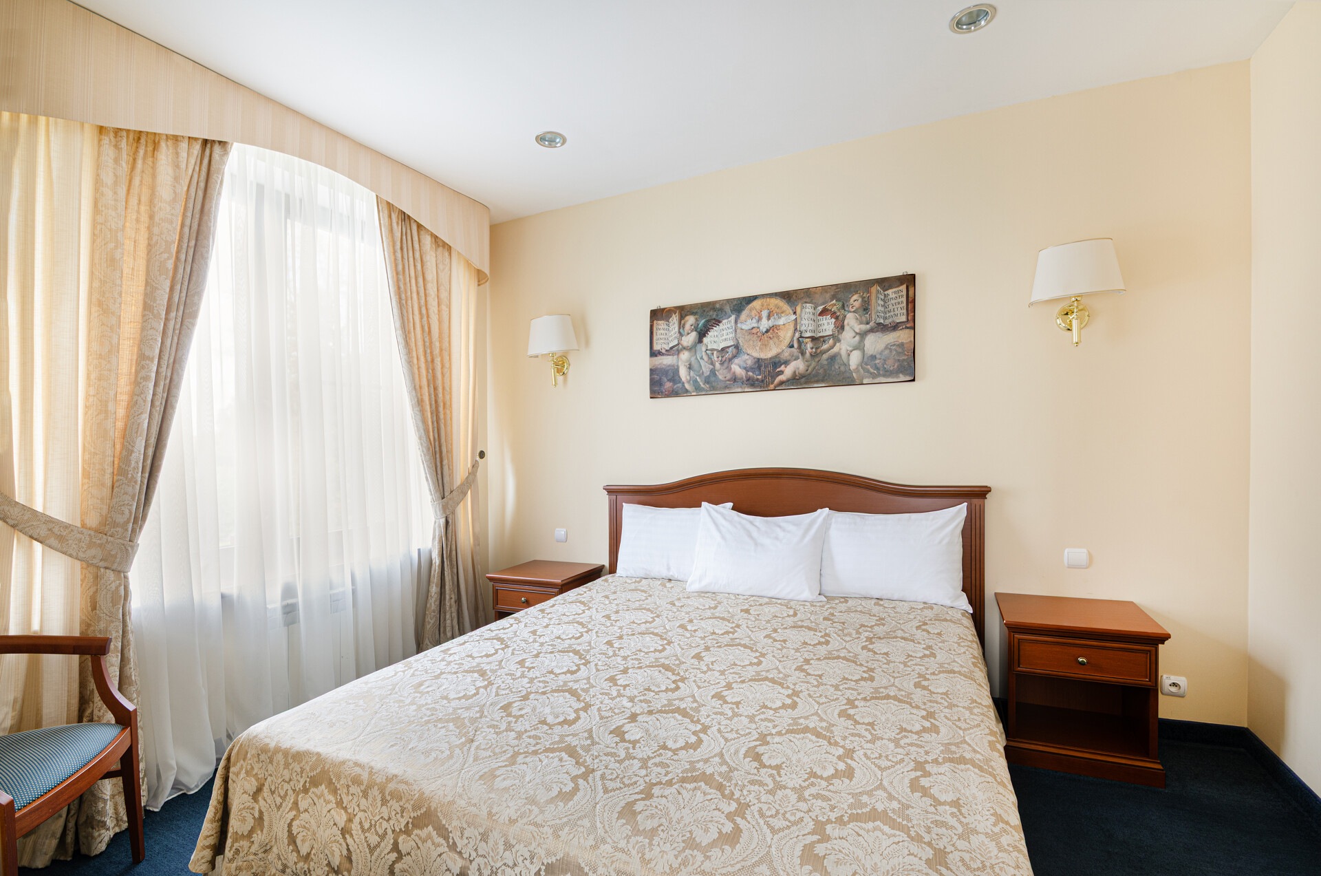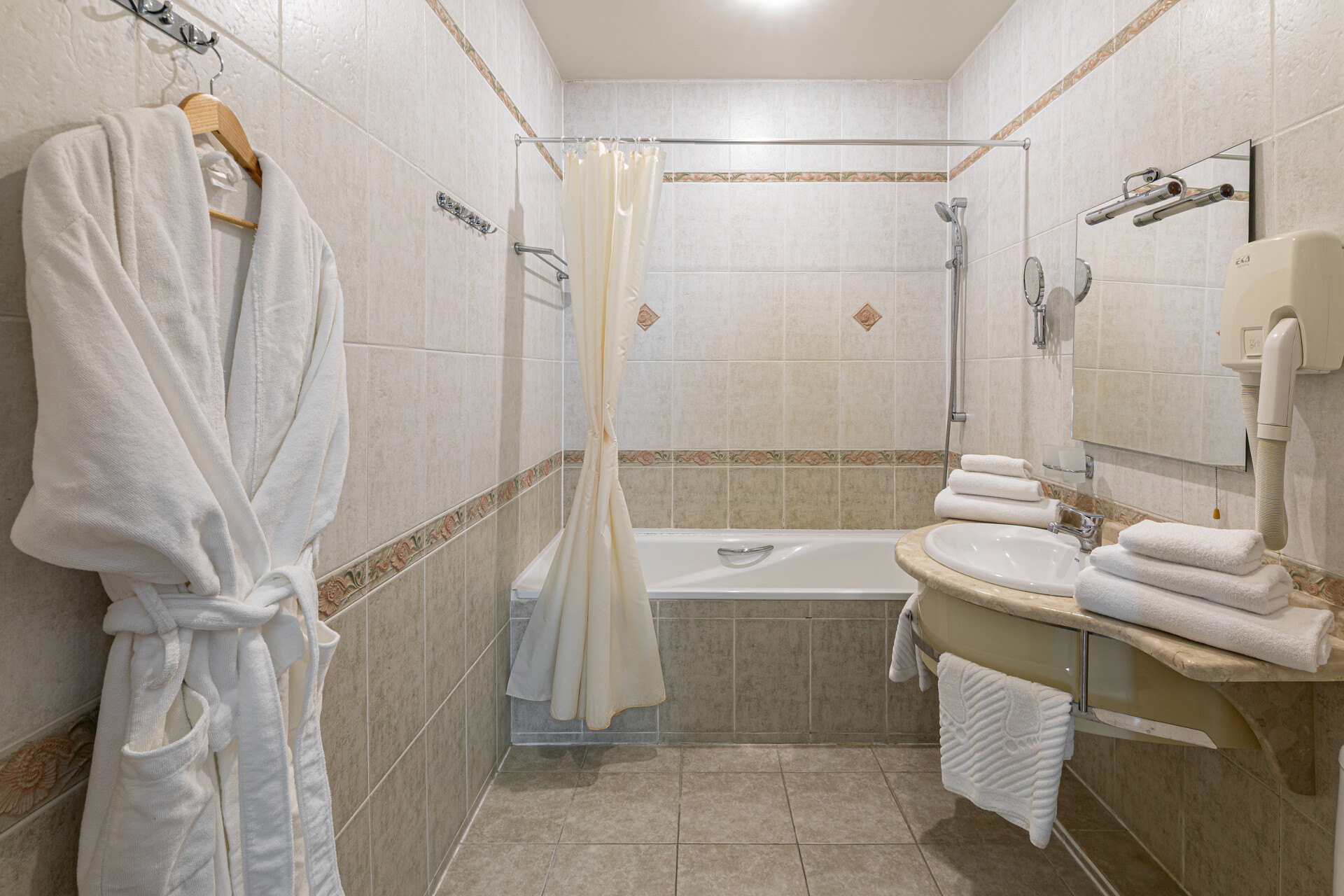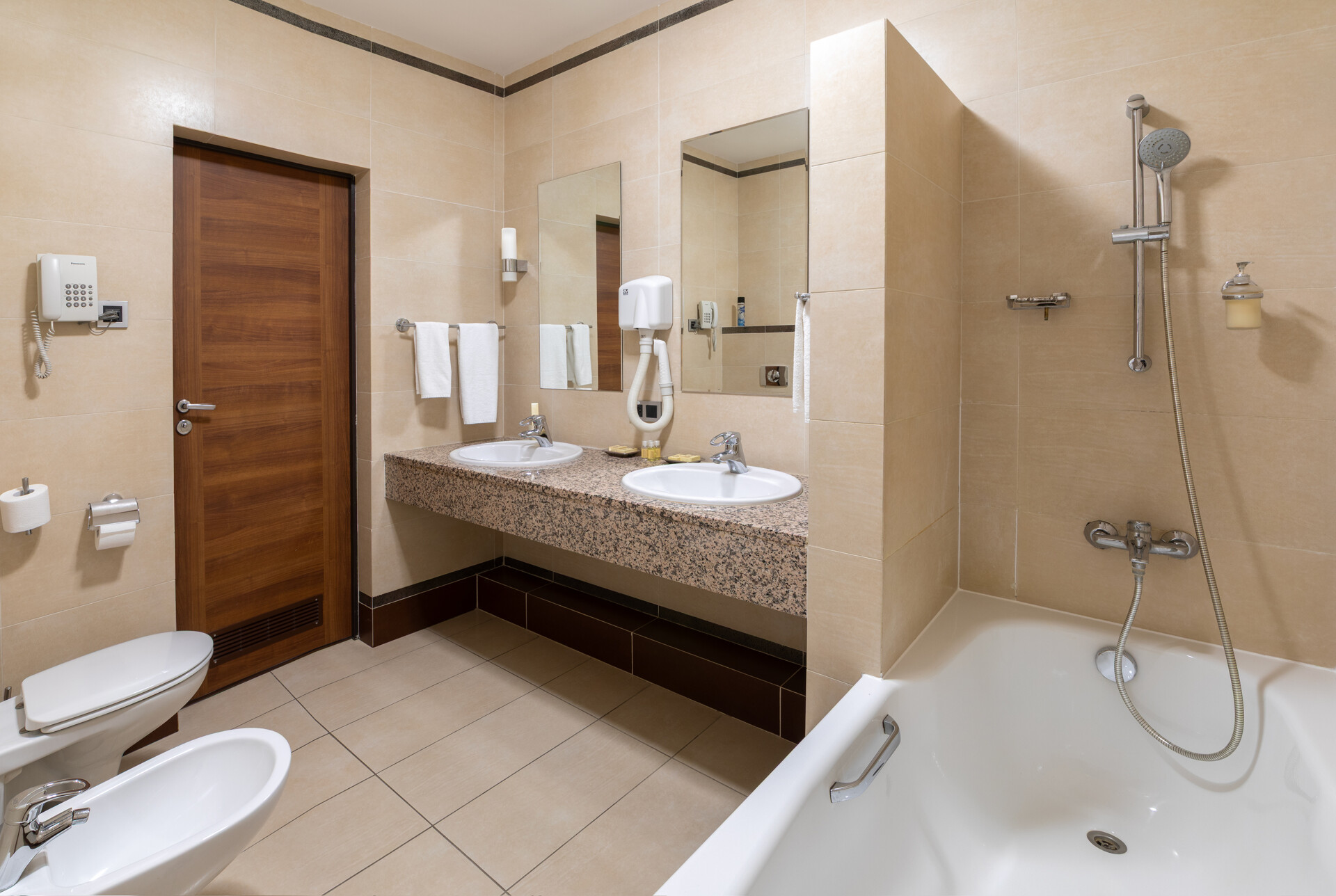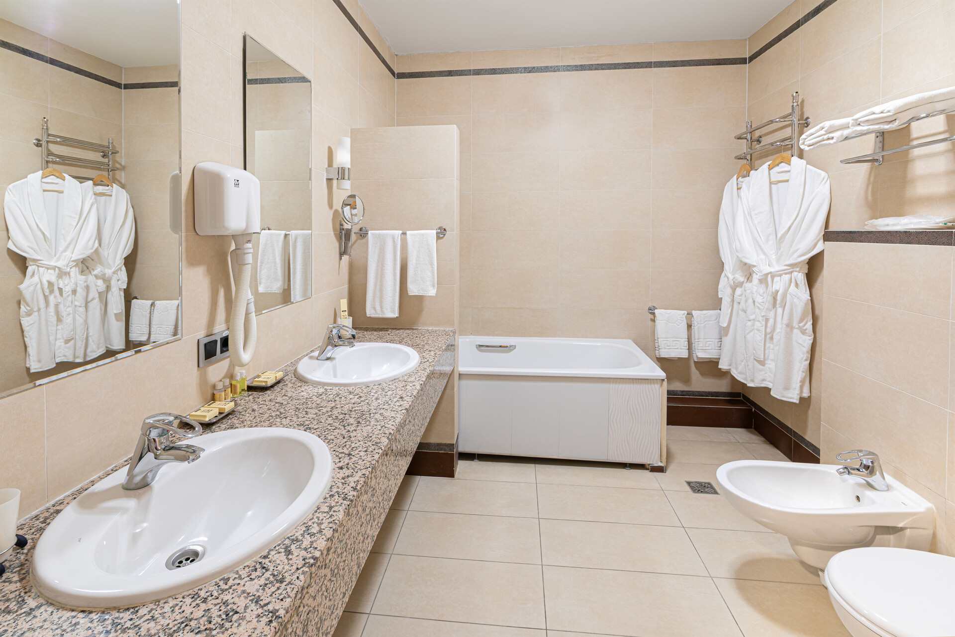 В номере: биде, ванна, туалет, умывальник / 2-спальная кровать, Wi-Fi, кондиционер, мини-холодильник, сейф, тв, телефон, фен